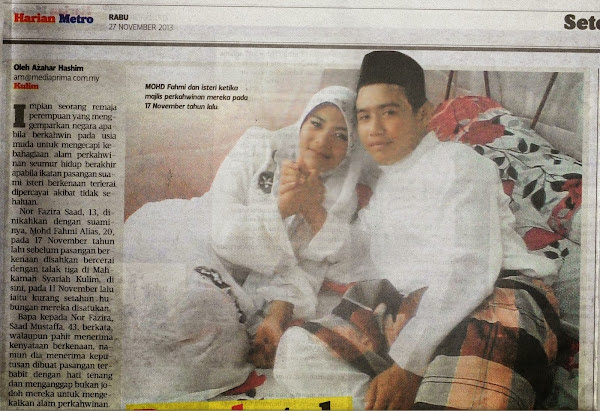 Kulim – Kurang seminggu sebelum sempat menyambut ulangtahun pertama perkahwinan, pasangan muda Nor Fazira Saad, 13 dan Mohd Fahmi Alias, 20, disahkan bercerai dengan talak tiga pada 11 November lalu di Mahkamah Syariah Kulim.